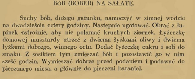 A może w tym roku 1935 bób był warzywem modnym? Przepis na sałatkę z nim zmieścił tygodnik „Bluszcz”. Ręczę, że będzie smakowała i dzisiaj. Wzruszyło mnie, że tak jak podano w nawiasie, na bób mówiła moja Babcia – bober. Czy dzisiaj ktoś jeszcze używa tej nazwy?