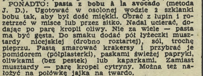 W tych czasach popularne – z konieczności oczywiście! – były takie kuchenne zastępstwa. Tu bób robi za awokado. O czym czytam z nostalgią. Wzrusza mnie (i porusza!) ówczesna pomysłowość. Pamiętam ją aż za dobrze. Oby nie wróciła, bo brała się z braku.