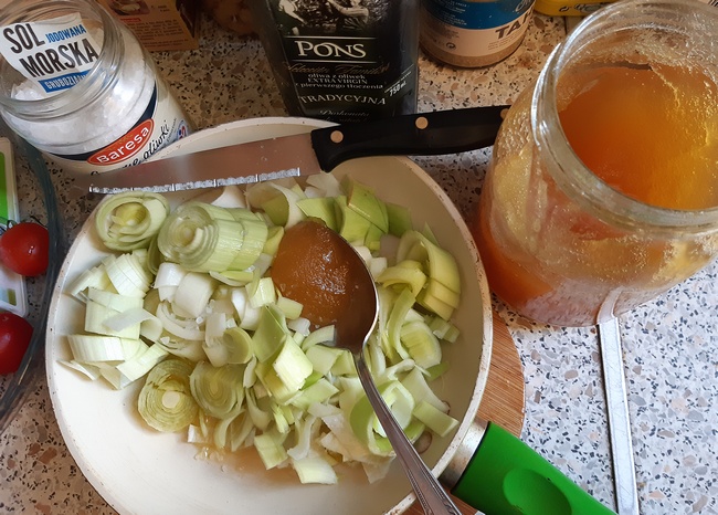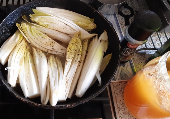 Jak widać, także do tego warzywa dodałam miód. Przy porach łagodził ostry smak porów, tutaj przełamuje goryczkę cykorii. Wiem, wiem, jest to raczej sałata zimowa niż warzywo podawane latem, ale jakoś wpadła mi w oczy, wpadła do koszyka i… musiałam jakoś spożytkować.