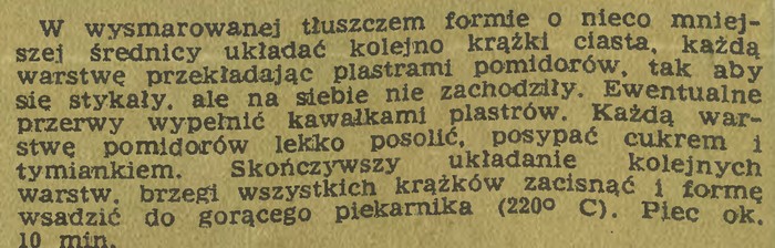 Mamy sezon na pomidory, można więc śmiało przygotować tę pomidorową tartę. Wygląda przepysznie. Piekąc podobną spód posmarowałam musztardą tzw. starofrancuską (z ziarnami gorczycy); przepis można znaleźć na blogu. W roku 1990 schłodzonego ciasta w naszych sklepach nie było. Podawano więc sposób wyrabiania ciasta kruchego – ambitni śmiało mogą się za nie zabrać. Tarta będzie nawet lepsza z ciastem własnego wyrobu. Ale dla takich jak ja leniuchów błogosławieństwem są ciasta sklepowe.