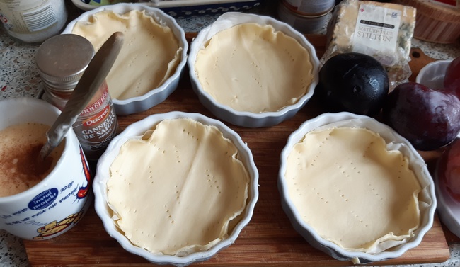 Moje były znacznie prostsze. Podstawą ich nadzienia uczyniłam sery. Kruchym ciastem wyłożyłam foremki większe i mniejsze, wypełniając różnymi serami i różniącymi się dodatkami. Ser połączyłam z owocami, w tarteletkach większych. Pierwszym był angielski ser pleśniowy stilton. Ser z charakterem, co się zowie. Uzupełniły go śliwki.
