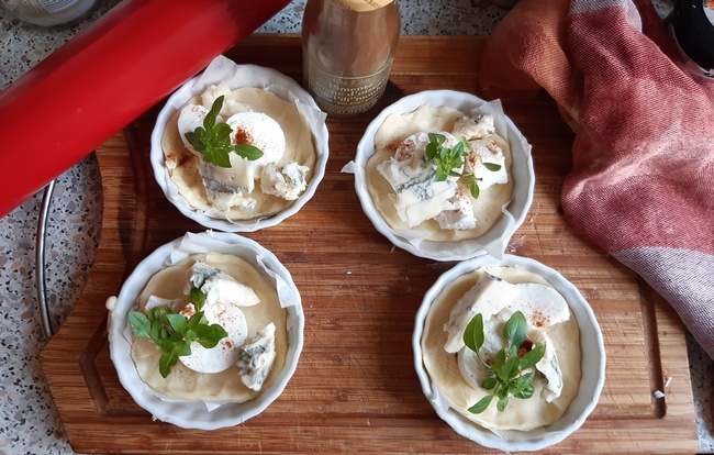 Foremki wyłożyć kruchym ciastem, jak wyżej (na papierze do pieczenia, ciasto nakłuć widelcem). Rozłożyć orzechy, krążki sera i pokruszony ser pleśniowy oraz liście bazylii, posypać ostrą papryką. Skropić oliwą.