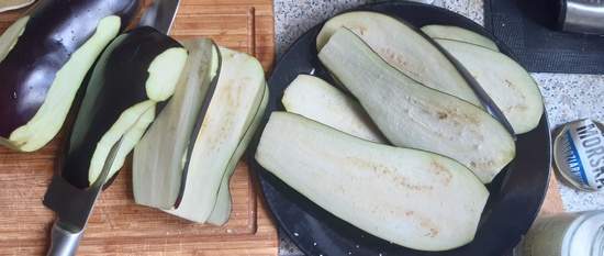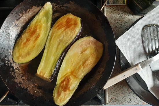 Bakłażany pozbawić szypułki i pokroić wzdłuż w cienkie plastry. Nasolić (jeśli to chcemy zrobić) grubą solą morską, przycisnąć drugim talerzem, odstawić na godzinę. Potem odlać sos, a plastry osuszyć ręcznikiem papierowym.