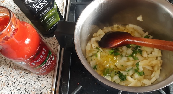 W tym czasie sporządzić sos pomidorowy: na oliwie zeszklić cebulę pokrojoną w kostkę z bazylią i zmiażdżonym lub posiekanym czosnkiem, dodać passatę pomidorową i pół szklanki wody, posolić, popieprzyć (kto chce, może dodać pół łyżeczki cukru), mieszając dusić aż sos zgęstnieje. Jeśli weźmiemy jajka, ugotować je na twardo, pokroić w plasterki. Utrzeć ser twardy (parmezan lub grana padano), a mozzarellę pokroić w plasterki.