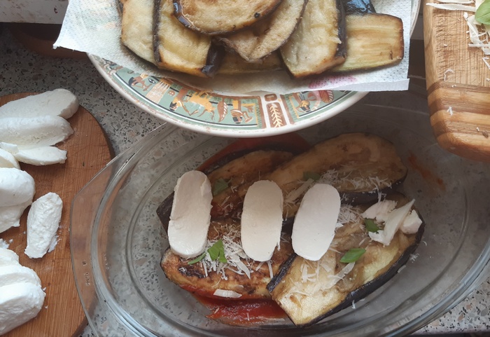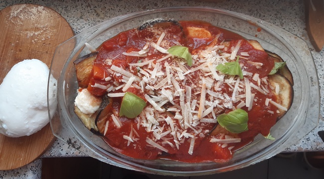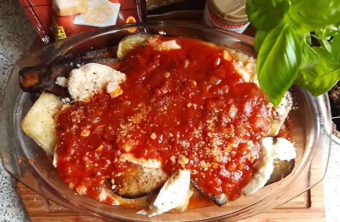 Dopowiem jeszcze, że poszukiwanie przepisów pozwoliło mi stwierdzić, że jest ich wiele, różnią się szczegółami. Podstawa jest jedna: bakłażany, sery włoskie (parmezan i mozzarella), sos pomidorowy. W jednym z wariantów jeszcze jajka na twardo. Raz je dodałam, ale to jednak ekstrawagancja i można z niej zrezygnować, no, chyba że zapragniemy jakiejś odmiany.