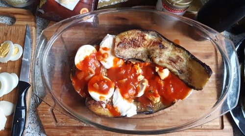 Na spodzie żaroodpornej formy lekko skropionej oliwą układać plastry bakłażanów. Posypać parmezanem, ułożyć plasterki mozzarelli. Rozsmarować sos pomidory, posiekane listki bazylii. Tak układać kolejne warstwy. (Jeżeli dajemy jajka, na serze układać ich plasterki).