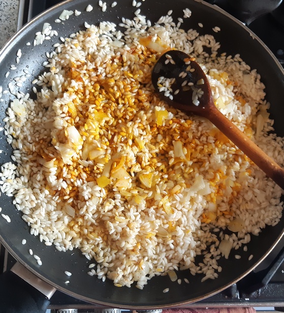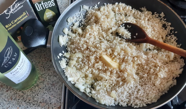 Na szerokiej patelni rozgrzać 2 łyżki oliwy, włożyć 2 łyżki masła oraz cebulę pokrojoną w drobną kostkę. Gdy cebula się zeszkli, dodać ryż. Smażyć mieszając, aby ziarenka ryżu też stały się szkliste i pokryły tłuszczem.