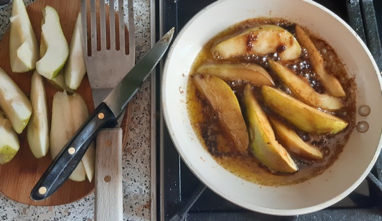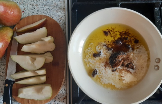 W czasie dolewania bulionu i mieszaniu ryżu, przygotować gruszki. Po obmyciu, osuszeniu i usunięciu gniazd nasiennych, pokroić je w cząstki. Na patelence roztopić masło, dodać cukier muscovado i rozmieszać.