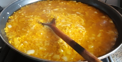 Wlać wino, mieszać aż ryż je wchłonie. Wsypać przyprawę do paelli lub szafran rozpuszczony w małej ilości bulionu. Rozprowadzić.