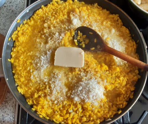 Po 15–20 minutach, gdy ryż będzie dość już miękki, dodać solidną łyżkę masła i starty ser. Wmieszać, aby ryż nabrał aksamitnej konsystencji.