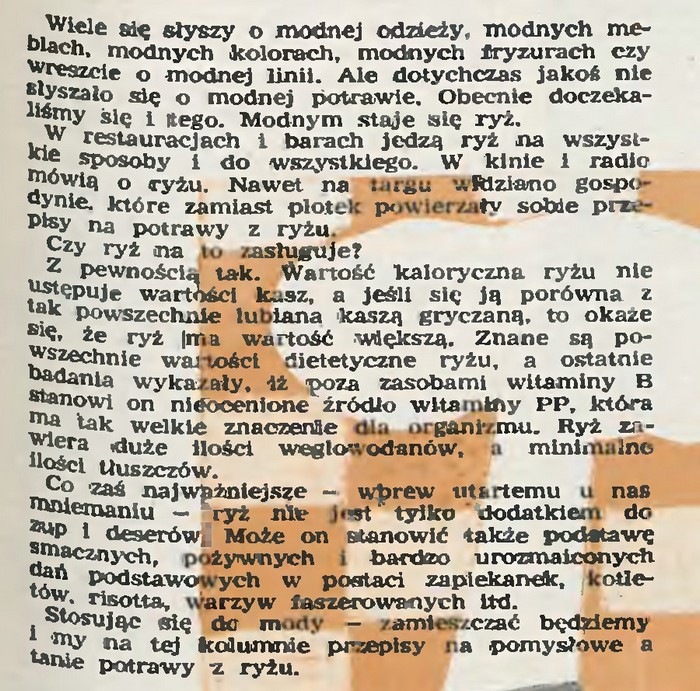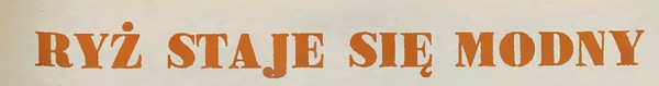 O ryżu można pisać w nieskończoność. Ale po co się wysilać, skoro znalazłam gotowca. W latach 60. tygodnik „Stolica” wpasowując się w czas gomułkowskiej małej stabilizacji lansował umiarkowany konsumpcjonizm. Nie do wiary, ale opisywanie, że gdzieś można kupić ciastka, a gdzie indziej sardynki, wydawało się cudowną odmianą po surowych latach 40. i 50., odmawiających ludziom prawa do radości z udanych zakupów i smacznego jedzenia. Z entuzjazmem opisywano nawet tak podstawowy produkt jak ryż.