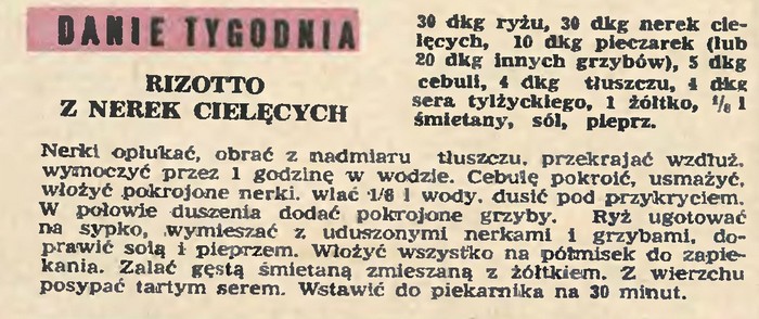 A wreszcie pojawił się też przepis na risotto. Raczej to zapiekanka ryżowa niż włoska potrawa, ale dla porządku przytoczę, choć dzisiaj amatorów podrobów jest coraz mniej!