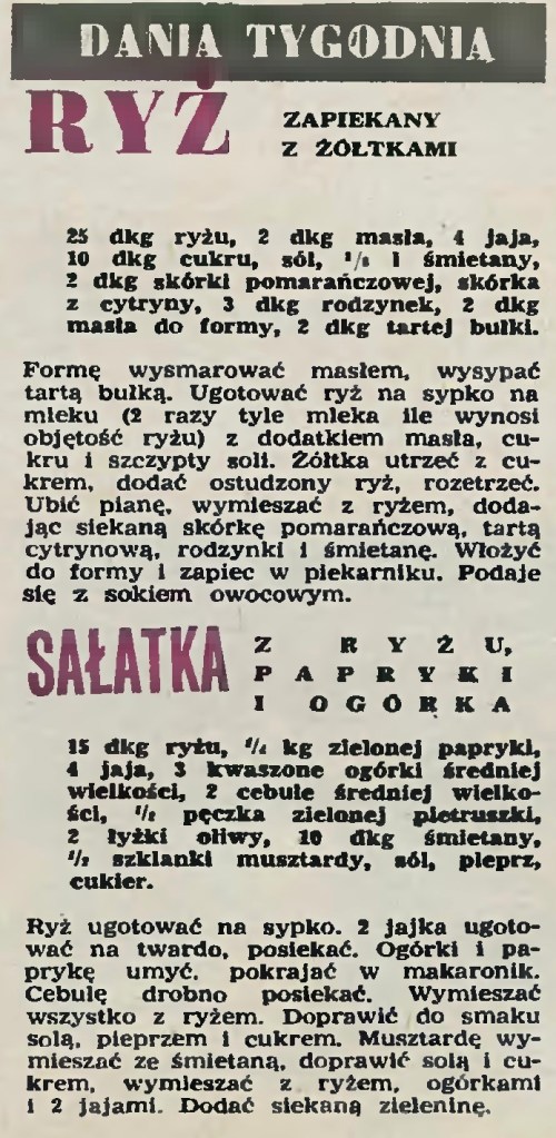 W tym roczniku „Stolicy” z roku 1960 przepisy na dania z ryżu pojawiały się jeszcze kilka razy. Zacytuję jeszcze dwa: na sałatkę (na początek obiadu) i ryż na słodko, wciąż u nas najbardziej znany i popularny. Także dzięki kuchni dla… przedszkolaków.