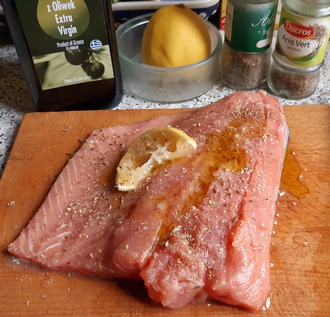 Dzisiaj proponuję coś z ryb. U mnie był to filet łososia. Ale można go zastąpić i rybą o białym mięsie. Morską lub rzeczną. Do tego zawsze jakaś surówka. Można kupić surówki gotowe (szukam takich z jednej firmy, bo nie ze wszystkich mi smakują). Ale przyrządzenie niebanalnej surówki do niebanalnie usmażonej ryby będzie bardzo łatwe.
