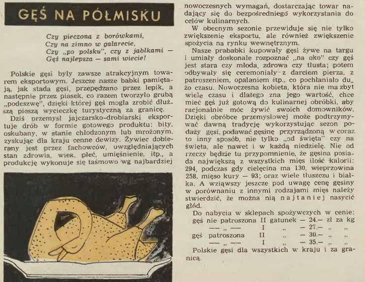 Na zakończenie opis gęsi z PRL-u. Nostalgiczny, bo pisany specyficznym językiem ówczesnej informacji, by nie rzec – propagandy. Z notki wynika, że gęś było łatwo kupić w każdym sklepie. Nic podobnego. Gęsi były towarem eksportowym. Na rynek krajowy „rzucane” były rzadko. Częściej można je było kupić na bazarze niż w uspołecznionym sklepie.