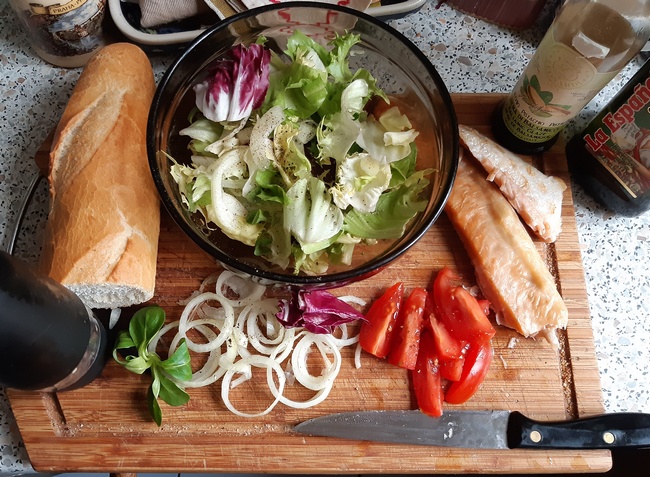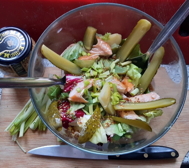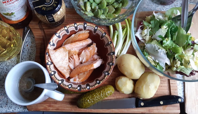 Do każdej sałat można dodawać świeżą paprykę, ogórek zamiast konserwowego może być świeży, sałatki można przyprawiać listkami ziół, w winegrecie zamiast octu może być cytryna, a w miejsce musztardy z gorczycą np. delikatna miodowa. Itd., itp. A zamiast łososia można dać szynkę lub cząstki jajka ugotowanego na twardo oraz fileciki anchois. A może ugotowane krewetki? Kombinacji sałatek mogą być tysiące. Każdy je zrobi inaczej. Mnie to krzepi. Lubię różnorodność, inteligencję i wyobraźnię. Nie tylko w kuchni, ale w kuchni też.