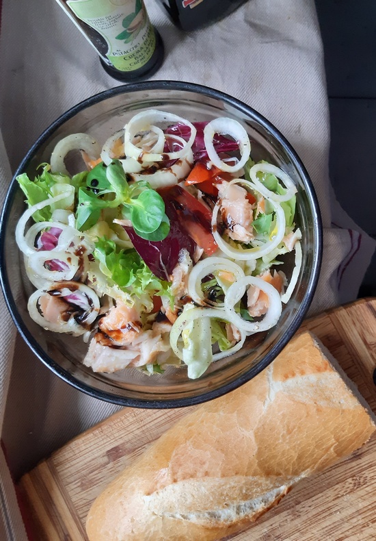 Taka sałatka może być daniem obiadowym lub kolacyjnym. Jedzona chociaż raz, a lepiej dwa lub razy w tygodniu, uzupełniona spacerem po parku lub jakąś inna aktywnością fizyczną, pomoże zrzucić niepotrzebne kilogramy. Proponuję komponować własne sałatki, z dostępnych składników. Ja przyrządziłam dwie. W obu dodatkiem był łosoś wędzony, sprzedawany w postaci tzw. brzuszków. Bywają one dość tłuste (zwłaszcza te duże), ale tłuszcz rybi, mimo że ma swoje kalorie, jest zdrowy. Przy tym wyczytałam, że np. w wypadku łososia – więcej zdrowego tłuszczu mają łososie dziko pływające niże te hodowlane.