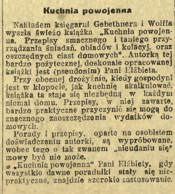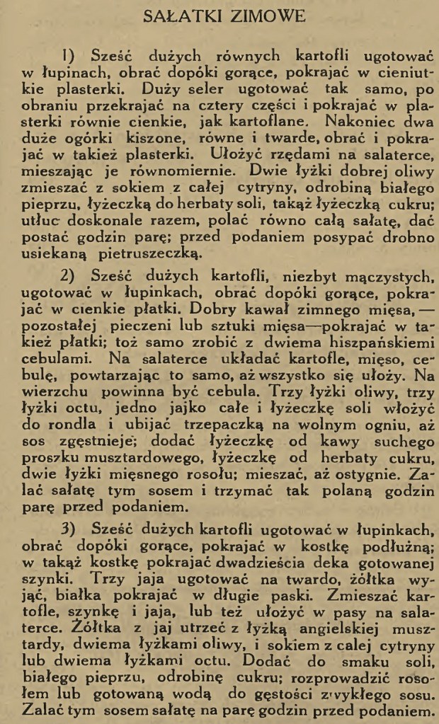 Za oknem zadymki śnieżne, a my myślimy o sałatkach. A zimowe mogą być nieoczekiwanie bardzo rozmaite. Klasyczne są te kartoflane, dzięki dodatkom, które bardzo lubią, wciąż zyskają nowy smak. Nie znudzą się nigdy. Osiem przedwojennych przepisów pochodzi z tygodnika „Bluszcz” nieomalże sprzed stu lat, z roku 1927. Opisała je Pani Elżbieta, czyli Elżbieta Kiewnarska, niezwykle zasłużona na niwie dziennikarstwa kulinarnego. Współpracowała z wieloma gazetami i pismami (obok „Bluszczu” m.in. z „Kurierem Warszawskim”, z tygodnikami „Kobieta w Świecie i w Domu”, „Pani Domu” i „Świat”, a nawet „Przegląd Ogrodniczy” – tyle na razie wyśledziłam), pisała książki kulinarne. Na przykład taką, dostosowaną do możliwości zbiedniałego po wojnach kraju, którą opisała „Gazeta Warszawska” w roku 1922.
