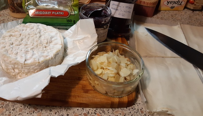 Płatki migdałów uprażyć na suchej patelni aż do lekkiego zazłocenia. Ciasto wyjąć z lodówki co najmniej kwadrans przed przygotowaniem. Rozłożyć na papierze, pokroić w spore kwadraty. Na każdy nałożyć porcję przetworu z owoców oraz trójkącik sera, posypać migdałami.