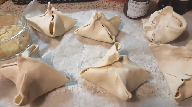Te paszteciki są typowym pomysłem z tematu: czym przyjąć niespodziewanych gości lub co zrobić, gdy nic nie ma w domu. Ser można, oczywiście zmienić. Przetwór także. Migdały zastąpić orzechami lub… pominąć. Stawiając upieczone paszteciki warto postawić i przetwór z owoców, i uprażone migdały.