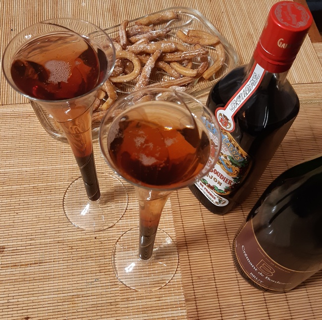 U nas winem musującym był crémant z Bordeaux. Po prostu taki miałam. Ta nazwa kryje wina musujące wytwarzane metoda szampańską, ale już nie w Szampanii. Najbardziej lubię wyrób z Alzacji. Ale i ten bordoski, i burgundzki do koktajlu Kir Royal jak znalazł. Sam Kir, już nie królewski, oznacza napój z białego wina burgundzkiego z likierem cassis. Istnieje też wersja łącząca likier z winem czerwonym, nazywana Kir Communard lub Kir Cardinale (nazwę można dobierać wedle poglądów!).