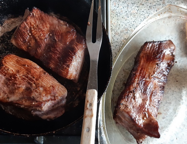 Piec ok. godzinę w 180 st. C albo 2–3 godziny w 100 st. Mają być bardzo miękkie. Sos zlać, odgotować, aby zgęstniał, doprawić do smaku; jeśli za rzadki, można zagęścić łyżką mąki pszennej lub ziemniaczanej.