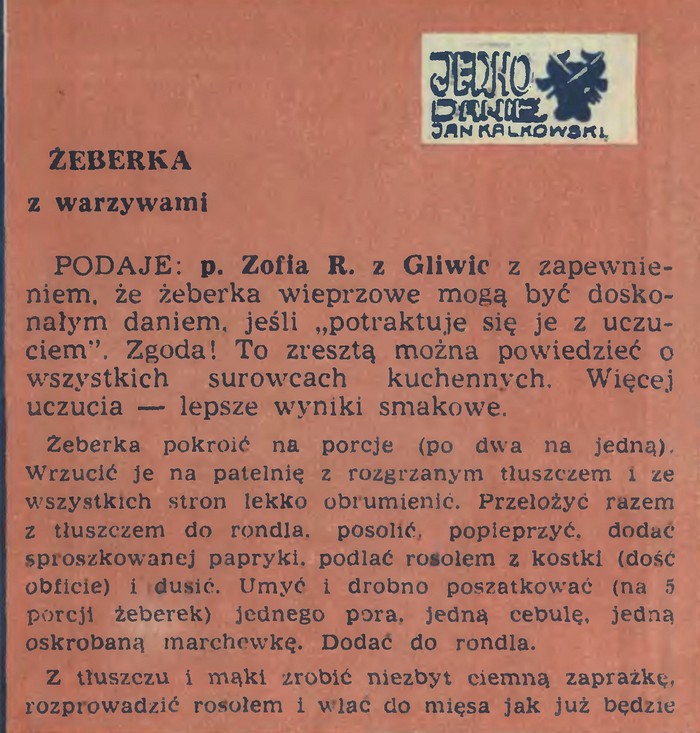 Kolejny pomysł na przyrządzenie żeberek podał red. Jan Kalkowski w swojej rubryce „Jedno danie”, którą przez lata, razem z wiernymi czytelnikami, ubogacał tygodnik „Przekrój”. Ten pochodzi z roku 1974.