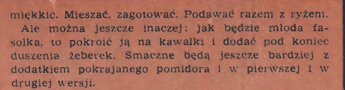 Na zakończenie dwa przepisy z czasów PRL-u. Pomyśleć, że dla dzisiaj młodych tak zamierzchłych, jak te z czasów I wojny były dla mnie… Pierwszy jest zagadką. Taki wycinek znalazłam wśród kuchennych przepisów mojej Mamy. Nie znam roku, nie znam pisma. Ale przepis na żeberka portugalskie atrakcyjny. Wklejam z nutką nostalgii. Może ktoś rozpozna, jaki tytuł miał taka rubrykę?