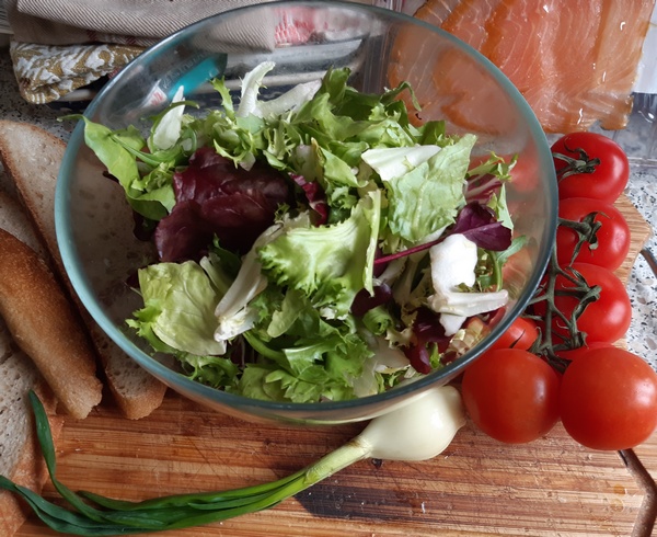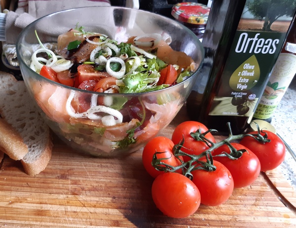 Ta sałata jest wartościowa a zarazem lekka. Łososia można zastąpić filecikami anchois lub wędzonym pstrągiem. Smaku przydadzą jej także świeże zioła, zawsze sypane tuż przed podaniem lub postawione oddzielnie na stole, aby każdy mógł ich dodać. To sałata wiosenna jak się patrzy.