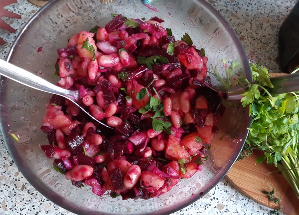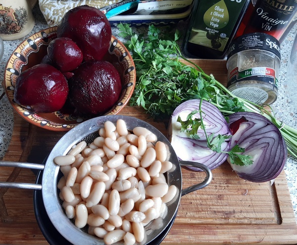 Fasolę odcedzić. Buraki pokroić w drobną kostkę. Ziemniaki, jeśli ich użyjemy podkroić tak samo. Cebulę w jeszcze drobniejszą kosteczkę. Wymieszać fasolę, buraki, cebulę. Przyrządzić winegret z oliw, octu i przypraw.