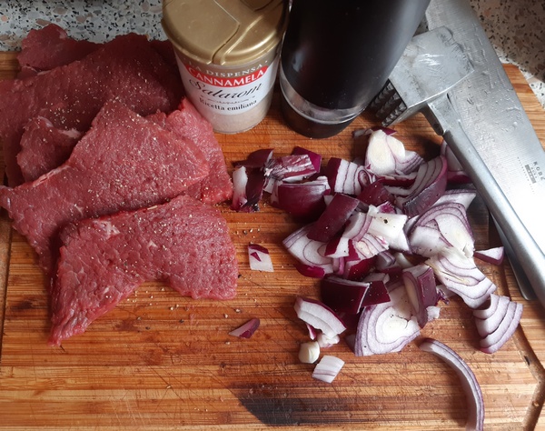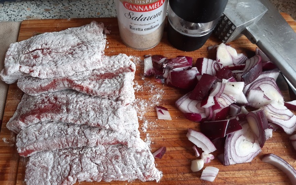 Mięso pokroić w plastry. Zbić je tłuczkiem, aby zrobiły się płaskie. Posolić je (oszczędnie, gdyż będą się dusiły w bulionie) i popieprzyć. Obtoczyć w mące, otrząsając jej nadmiar. Cebulę pokroić.