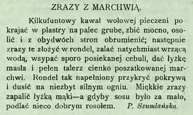 Kolejne ciekawe zrazy bite wypatrzyłam w warszawskim „Tygodniku Mód” z roku 1910. Podpisała się pod nim Paulina Szumlańska, redaktorka i autorka kilku książek kucharskich.