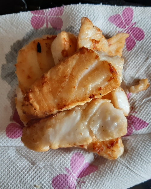 Na patelni rozgrzać olej. Rybę posolić, pokroić na kawałki lekko obtoczyć w mące. Smażyć kolejno na rozgrzanym oleju z obu stron, wyjmować na papier kuchenny.