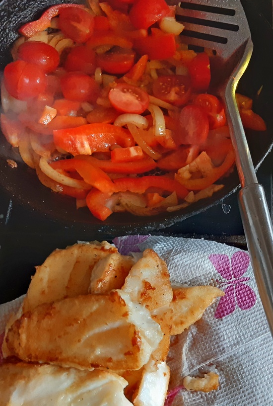 Gdy ryba usmażona, wytrzeć patelnię, dodać łyżkę lub dwie oleju, zeszklić pokrojoną w półplasterki cebulę i posiekany czosnek (nie powinna zbrązowieć). Wrzucić paprykę pokrojoną w paski, przekrojone na pół pomidorki (duże pokroić w kostkę). Chwilę podsmażać mieszając. Dolać wino, doprawić solą i sypką papryką. Dusić ok. 5 minut.