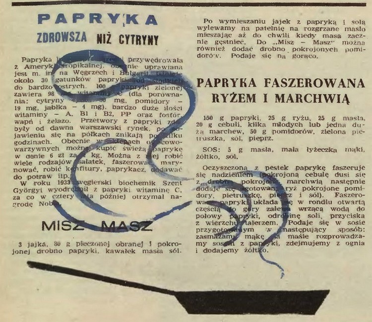 Papryka przez lata powojenne była u nas prawie nieznana aż do lat sześćdziesiątych. Wtedy zaczęła się pojawiać i nawet być modna. Sprowadzano ją przeważnie wcale nie z Węgier, lecz z Bułgarii. Zaświadcza to tygodnik „Stolica” z roku 1961.