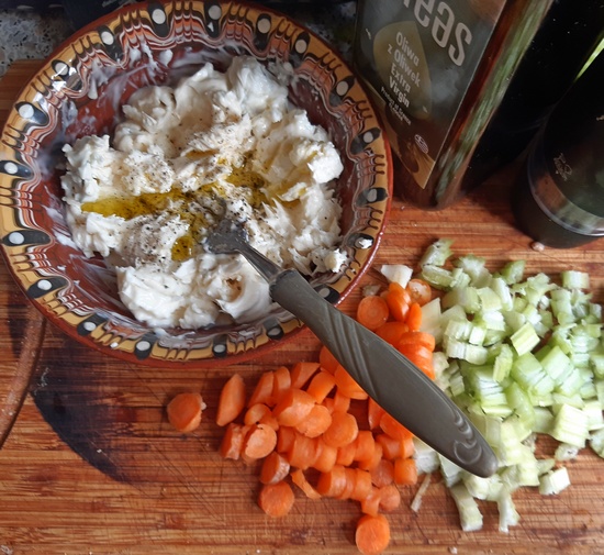 Ser zmieszać dobrze, np. widelcem, z oliwą. Łodygi selera i marchewki oczyścić, obmyć, osuszyć i pokroić drobno.