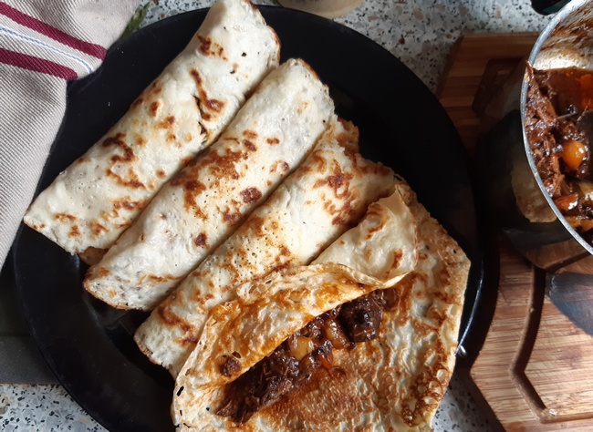 W poprzednim odcinku bloga przedstawiłam, jak przyrządzam słynne francuskie mięso duszone – boeuf bourguignonne, czyli wołowinę o burgundzku). Mięso zostało. Wypełniłam więc nim właśnie naleśniki. Takie najprostsze, z lekkiego ciasta. Tyle że do mąki pszennej dodałam jaglaną. I właśnie tak można i warto robić. Zmieniać mąkę z pszennej na gryczaną (w całości lub w części), na żytnią, orkiszową, jaglaną… no, każdą inną.