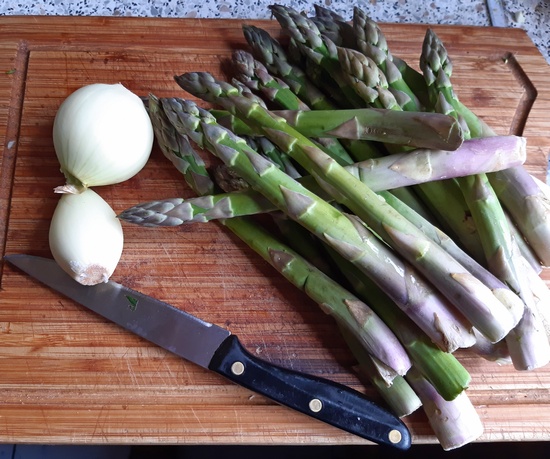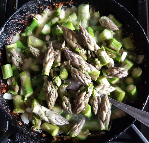 Szparagi obmyć, delikatnie osuszyć, odciąć twarde końce. Jeżeli potrzeba, zdjąć skórkę (zwykle w szparagach zielonych nie ma potrzeby), pokroić na kawałki, zostawiając całe główki. Cebulki drobno pokroić. Na patelni rozgrzać łyżkę oliwy i łyżkę masła. Zeszklić najpierw cebulki, dodać pokrojone szparagi (bez główek), po obsmażeniu 2–3 min. Wlać szklankę bulionu. Dusić 6–8 minut, w połowie dorzucając główki.