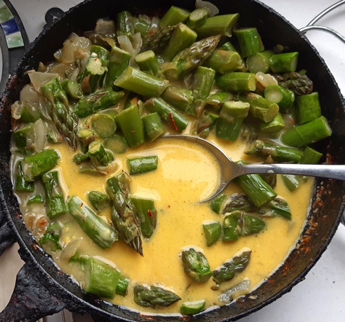 Gdy szparagi trochę zmiękną, ale pozostaną kruche, zalać je śmietaną z szafranem. Poddusić 2–3 minuty.