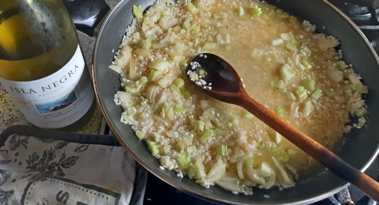 W tym samym czasie pokroić drobno trzecią cebulkę. Na patelni, w której przygotujemy risotto rozgrzać znowu łyżkę oliwy i łyżkę masła. Cebulkę zeszklić, dorzucić ryż, mieszać. Gdy każe ziarenko ryż się pokryje tłuszczem, wlać wino. Mieszając smażyć, aż odparuje.