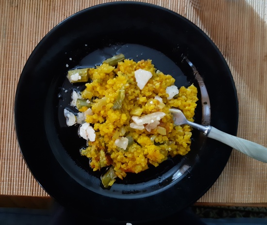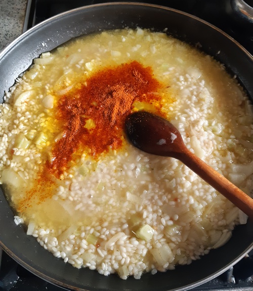Do ryżu wlewać pół szklanki bulionu, dodać łyżkę mielonego szafranu.