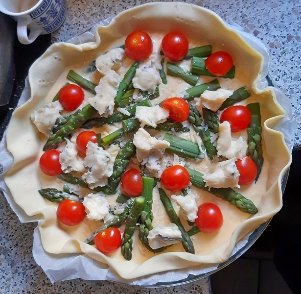 Na ciasto wylać jajka ze śmietaną i serem. Rozłożyć na nim szparagi i pomidorki, przykryć pokruszoną gorgonzolą.