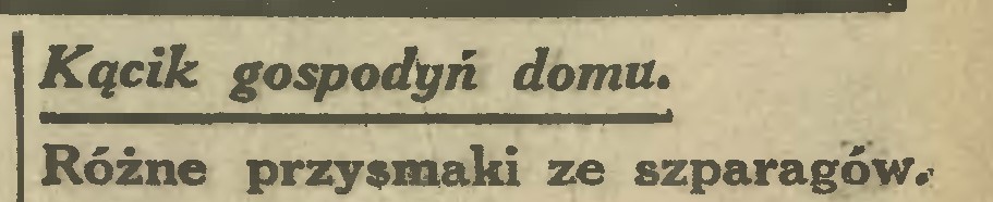 Co do szparagów, chciałam przypomnieć, co już kiedyś radziłam, aby obierzynek z nich nie odrzucać, gdyż wysuszone przydać się mogą jako doskonały dodatek, podnoszący smak rosołu. Szparagi należy przed ołupaniem dobrze wymyć, a obciągnięte czyste łupki rozsypać na czystym papierze, nie płucząc ich już przed suszeniem; ususzone przechowywać w woreczku. Do wody, w której mają się szparagi gotować, daje się tylko szczyptę cukru i łyżeczkę masła, po 30 minutach gotowania dosypuje się łyżeczkę soli. Sól dodana do jarzyn z początku gotowania czyni je łykowatemi. Woda z pod szparagów nadaje się do nastawienia w niej mięsa na rosół, podnosi również smak ziemniaczanki lub zupy jarzynowej, nie należy jej więc wylewać.