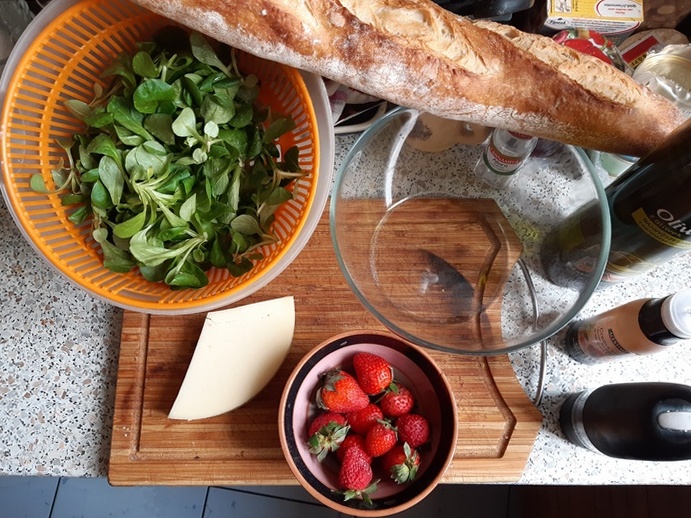 Gdy minie sezon truskawek, w ich miejsce można dodać morele lub brzoskwinie pokrojone w paski. Albo figi. Zamiast sera twardego można dodać pleśniowy, np. gorgonzolę lub roquefort. Mnie taka sałatka, podana z bagietką, świetnie smakuje jako danie obiadowe.