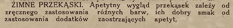 Wszelkie rodzaje pasztecików uchodzą za wykwintne przekąski, kanapki już bardziej pospolite, ale wygodne, bo podaje się zimne i można je przyrządzić nawet na kilka godzin przed podaniem. Bardzo elegancko wyglądają małe kąski, które je się widelcem, co jest bardzo sympatyczne ze względu na ręce, któremi nie powinno się brać kanapek. Kąski takie, to właściwie miniaturowe kanapki, których już nie trzeba dzielić. Różne auszpiki z ryb, vinaigrette, sałatki majonezowe i inne można podawać jako przekąski w muszelkach. […] nie powinno się ustawiać osobnego stołu z przekąskami, tylko podawać je na tacy i na ten cel właśnie najlepiej nadają się paszteciki, kanapki i muszelki. Dlategoteż nie wymieniamy tu innych zimnych przekąsek. Jeśli podaje się sałatkę, auszpik czy vinaigrette w muszelkach, należy pamiętać o bułeczkach, bez których czasem ktoś nie lubi tych ostrych przekąsek.