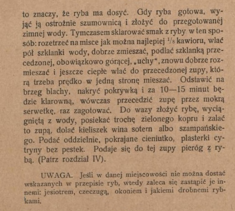 Mięso obrane z ryb, przepuścić przez maszynkę, usmażyć jajecznicę z 3 jaj, przefasować ją przez gęste sito, wymieszać z rybim farszem, dodając dwa całe jaja, trochę pieprzu, zielonej pietruszki, szczypiorku, soli, tartej bułki, masła i odrobinę mąki; wyrobić doskonale i tarzać równe, niezbyt grube wałeczki, poczem ugotować je w przyrządzonej zupie, wyjąć łyżką durszlakową, pokrajać na skośne plasterki i włożyć również d o wazy, zalać zupą, którą posypać po wierzchu siekaną zieleninką. Gdyby zupa okazała się zbyt bladą, zaciągnąć ją odrobiną mocnego karmelu.