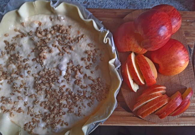 W jogurcie rozkłócić jajka. Masę wylać na ciasto, posypać granolą. Na wierzchu rozłożyć jabłka stawiając je ciasto na sztorc, aby skórka była na wierzchu.
