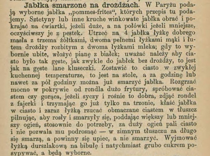Tyle zupa. Jako potrawę, bo już nie jako leguminę podawaną kiedyś na zakończenie obiadu, my możemy podać dziewiętnastowieczne jabłka usmażone za Lucyną Ćwierczakiewiczową. Przepis podała w kalendarzu na rok 1881. Bo nie tylko książki kucharskie publikowała, ale i coroczne kalendarze. W tym czasie popularne i chętnie kupowane, zamieszczały, obok dat, wiele pożytecznych informacji.