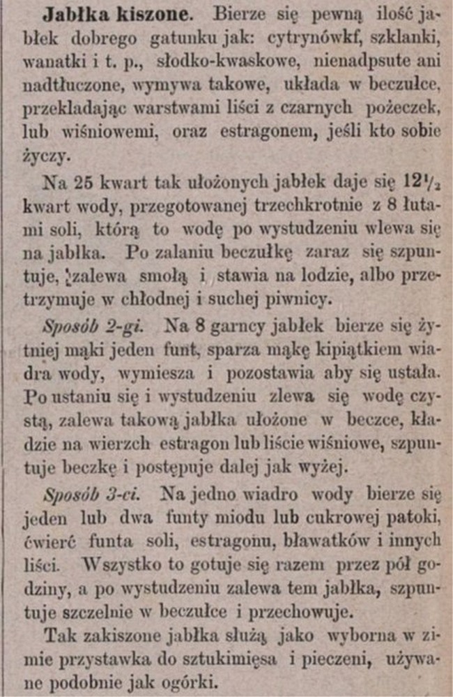 Kto ma duże ilości jabłek i nie może patrzeć, jak się marnują sporządzi może w postaci kiszonek. Są niezwykle zdrowe, regulują trawienie, mają wiele witamin, pektyn, przeciwutleniaczy. Stareńkie przepisy naszych praprababek, pochodzą z lat 1878-79, z wydawanego w Warszawie pisma „Gospodyni Wiejska”.