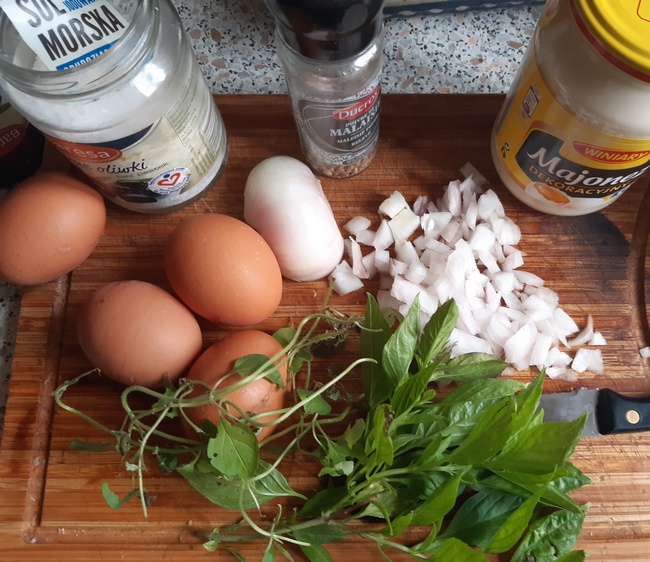 Jajka pokroić w drobną kostkę. Podobnie pokroić cebulę. Wymieszać jajka z cebulą, domieszać majonez. Posolić (delikatnie, do smaku), popieprzyć. Podając posypać zieleniną. Podać do pieczywa lub na pieczywie, np. na świeżej bagietce.